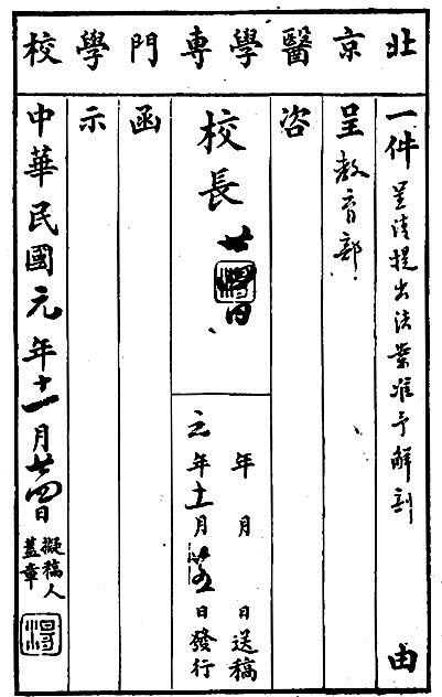 1912年11月24日,北京医学专门学校(现beat365唯一官方网站前身)首任校长汤尔和呈文教育部,请求公布由他起草的《解剖条例》,此时距他就任校长刚刚39天。