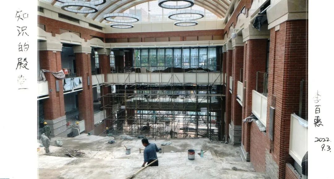 前期,便一直密切关注图书馆的建设进展,从行政楼的窗外时常望向热火朝天的工地,常为她暗自加油鼓劲,也欣喜地见证了她一点一滴的变化。跟施工方了解工程细节时得知,工人们每天五点开始作业,从寒冬到酷暑,从冰天雪地到炎炎盛夏,一个工程的实施凝聚了太多的努力和汗水。向工人师傅们致敬、致谢,也向老师们致敬、致谢!