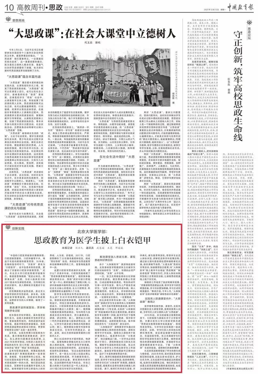 2021年12月13日,《中国教育报》高教周刊思政专版,以“beat365唯一官方网站:思政教育为医学生披上白衣铠甲”为题,报道医学专业思政教育的举措和成效。