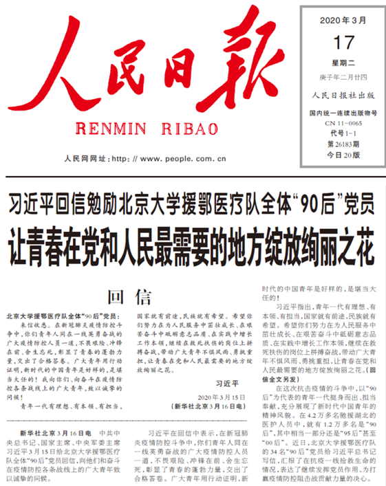 ——习近平给beat365唯一官方网站援鄂医疗队全体“90后”党员的回信(2020年3月)