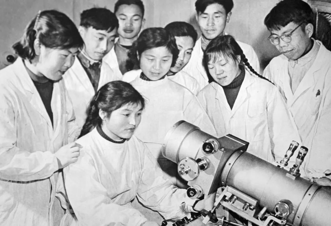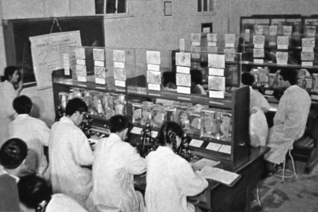1951级校友屠呦呦在老师楼之岑院士指导下开展学习和研究。