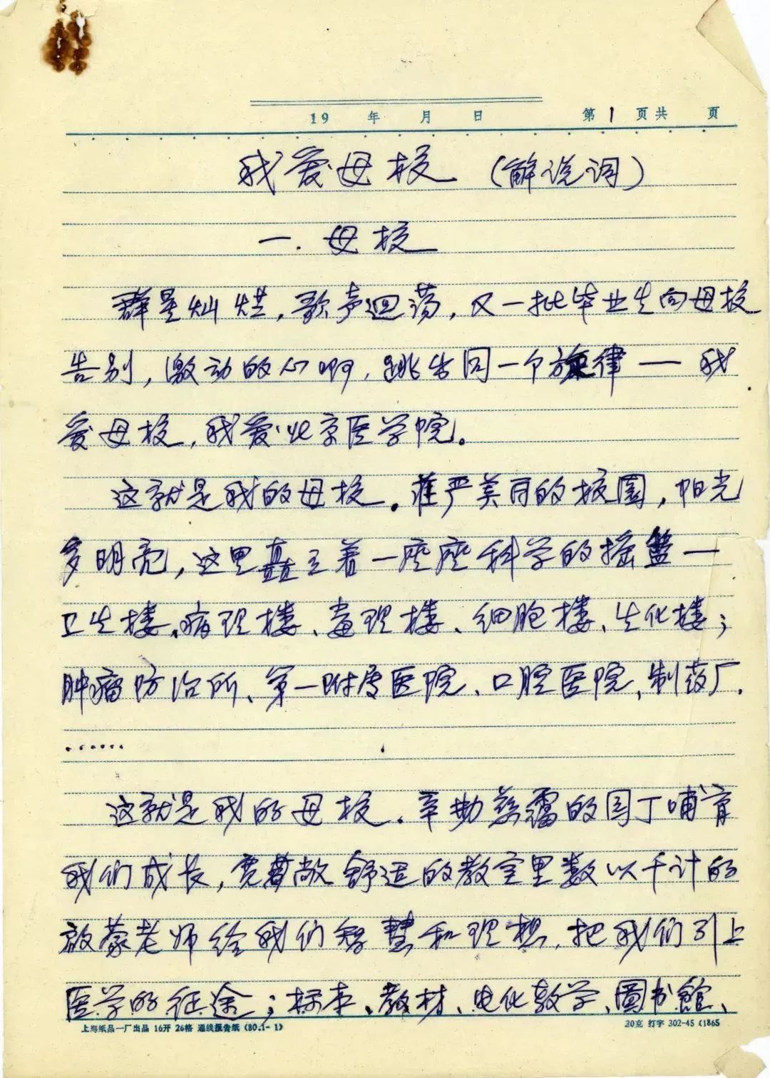 1982年,我参加了北医70周年校庆晚会,作为合唱团成员参与了《我爱母校》的合唱。当时合唱队里有很多我们班同学,大家毕业后各奔东西,又因为校庆聚在一起,很是欣慰感慨。这首歌是我们班同学写的歌,我们也唱了很多年,再度歌唱时心中还是一如既往的喜爱,感觉是一种很朴实的情感,无需多言。就像歌词写的那样,我们的老师很敬业、校园很优美、同学很努力,正是这样实事求是又看似直白的表达,就是我们这一代人对校歌最朴质的情感。即使现在再去听这首多次改版的歌曲,我的情感也是这样。