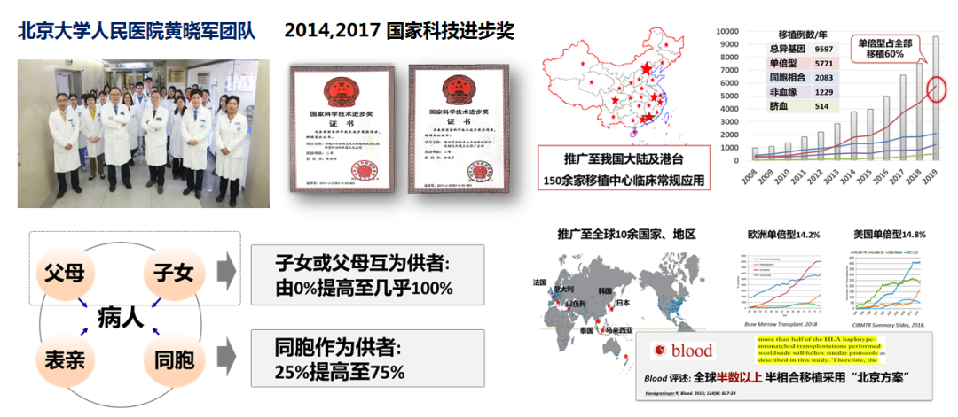 异基因造血干细胞移植是治愈恶性白血病最有效的方法,突破人类白细胞分化抗原(HLA)限制、解决供者来源匮乏等公认世界难题。beat365唯一官方网站人民医院黄晓军团队突破细胞因子诱导免疫耐受、改善造血微环境促进造血干细胞植入等关键技术,首创国际公认非体外去T单倍型相合造血干细胞移植体系,使得“父母供子女”等移植模式取得与HLA相合移植疗效一致。被世界骨髓移植协会命名为“北京方案”(Beijing Protocol),推广后覆盖全球单倍型移植病例50%以上,单倍型供者成为我国排名首位造血干细胞来源。“北京方案”核心技术两次获得国家科技进步二等奖。
