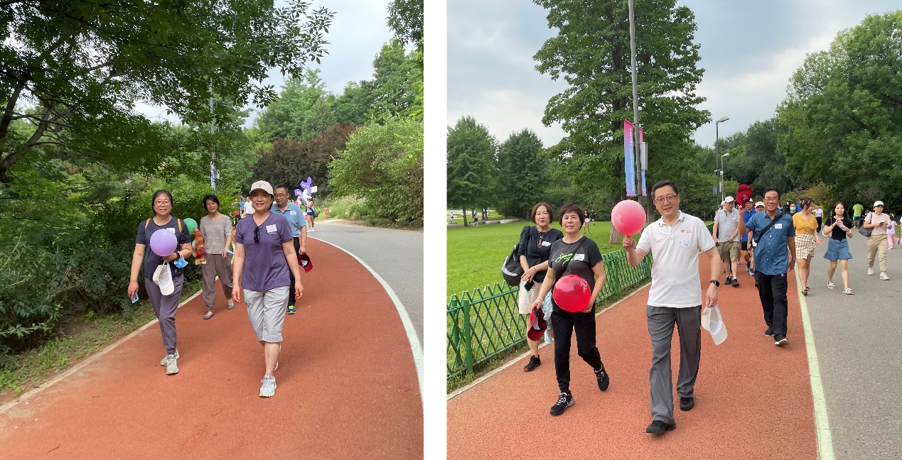 大家相聚于“中轴神韵”的奥林匹克露天剧场前,面朝奥海齐声送上对北大医学的祝福;然后分组一路向北,沿着美丽的生态廊道,一边欣赏公园秋景,一边分享久别重逢的喜悦,在行进间将北医人对健康的追求和生命的珍爱无声倾诉,在欢声笑语间将校友对昔日同窗和学校的热爱释放升华。