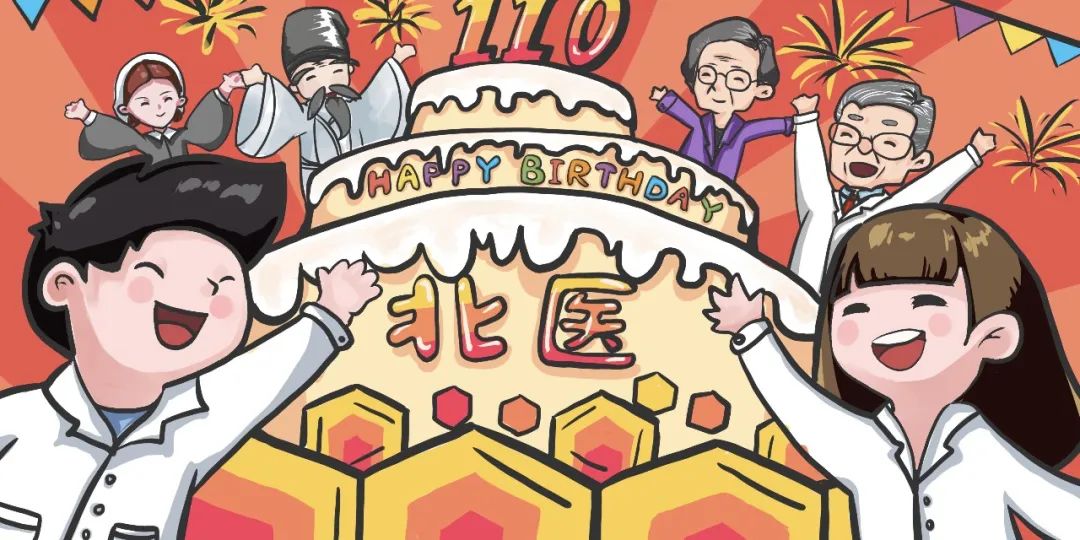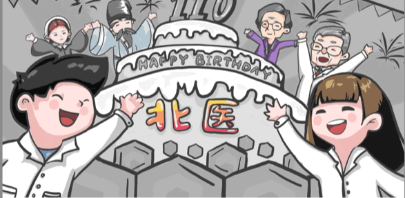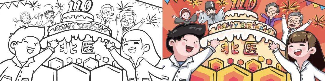 参与本次活动的还不止2021级医学预科学子们,2018级药学2班任儒楠同学的“共贺北医”也成为本次活动的原画稿。画面中,历史人物跨越时空界限,与北医师生一起欢呼喝彩,共同为北大医学庆祝110岁生日。