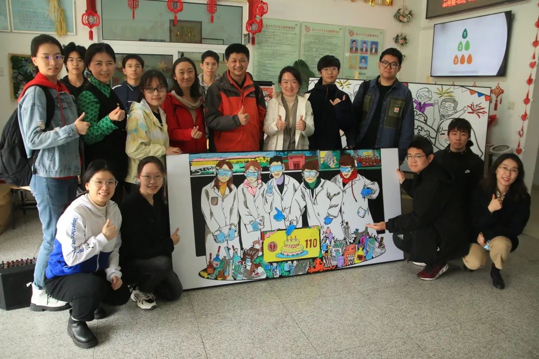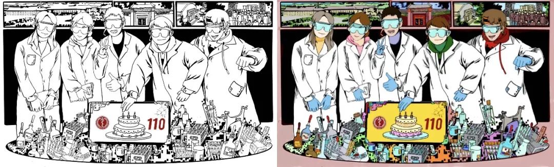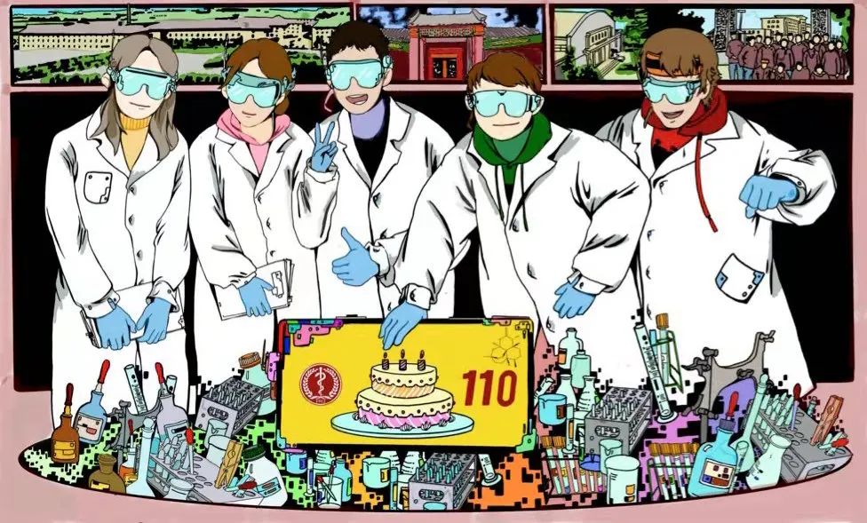 主创之一田小禾同学这样描述他们的作品:“这幅画取材于我们班级做实验的画面,挑选了几张照片融入画里。作为药学专业的学生,实验室是我们的主战场,在试管与烧杯的碰撞中,我们用青春献礼北医110周年。”