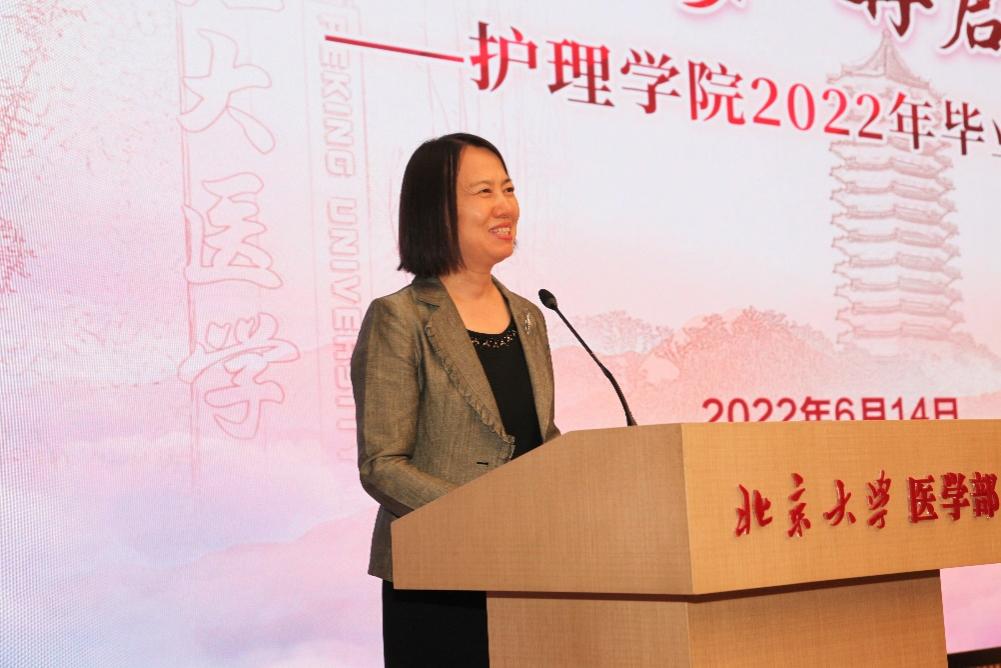 护理学院党委书记陆虹介绍毕业生情况,她指出,护理学院2022届毕业生的就业去向遍布祖国各地,有的同学选择去往西部地区从事护理工作;有的同学选择成为一名选调生,前往祖国最需要的地方去发光、发热;有的同学选择留在高等学府继续深造,留下了北大护理人追求科学高峰的身影。希望未来同学们在医疗、卫生、教育、科研领域,践行让青春之花在党和人民最需要的地方绽放的青春使命。