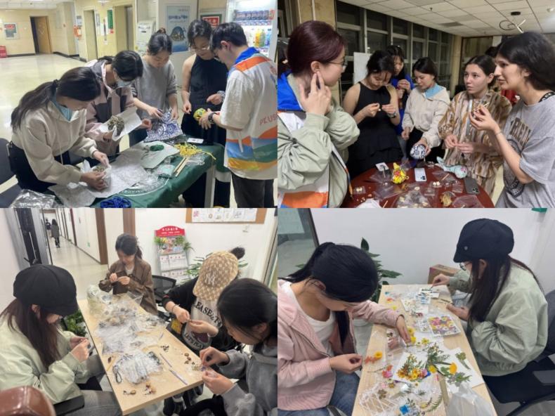 4月17日和24日,青绿志愿者们走进留学生宿舍北楼和学生宿舍6号楼,为楼内的同学们带来艾草锤、中药耳饰和干花书签的手工制作体验活动。来自多个国家的40余名同学与药学专业志愿者齐聚一堂,在制作过程中了解了药用植物的基本功效,体会到中医药文化的博大精深。