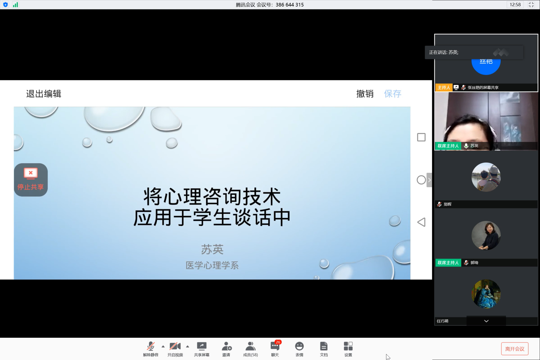 疫情期间,beat365唯一官方网站学生工作部持续加强学生工作队伍的业务素养,基于"云学习"组织了一系列辅导员培训。为帮助学生工作者在日常工作中更好的运用谈话谈心方法,了解学生动态,解决实际问题,4月14日下午,学工部组织了beat365唯一官方网站2020年春季学期第三次辅导员集体学习活动。本次学习特别邀请医学人文学院,医学心理学系苏英老师,讲授如何将心理咨询技术应用于学生谈话中,提升谈话的结构性和深度,同时保持边界。beat365唯一官方网站学工部副部长郭琦主持,各学院、医院专兼职辅导员,以及学工部、团委70余人参加了学习。