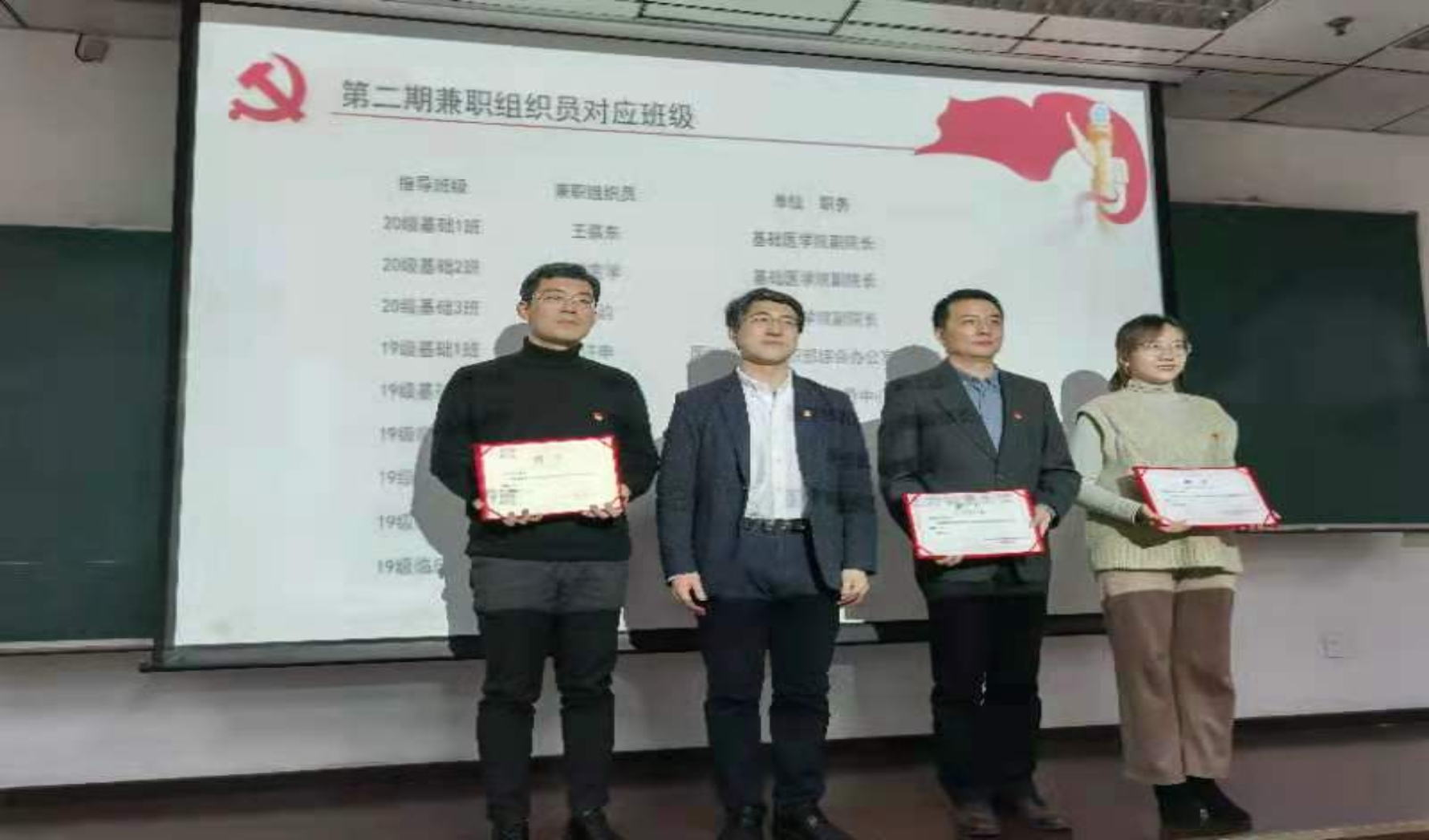 聘请兼职组织员协助支部开展培养工作是基础医学院本科生党支部的特色做法,为了对第一期聘请的、因班级毕业或进院不再担任兼职组织员的赵成知老师和柳絮老师表示感谢,学院党委委员郑乐民老师颁发了学院党委和本科生党支部精心制作的致谢函。同时,郑老师为到场的第二期兼职组织员颁发聘书,并向兼职组织员对基础医学院党员发展工作的大力支持表示由衷的感谢,希望同学们能在各位老师的培养下取得更大的进步。