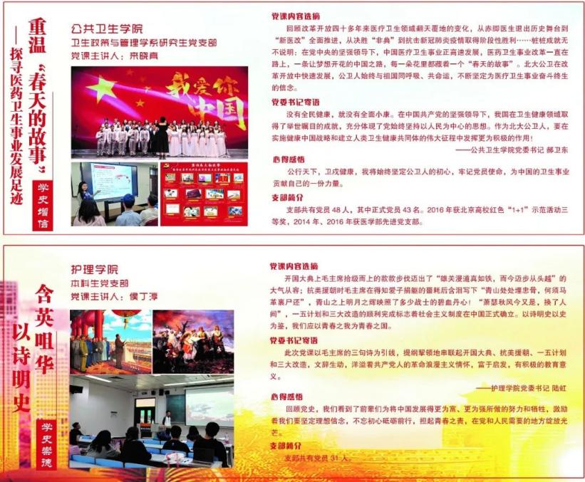 在创新形式中努力向学。基础医学院开展“冬日暖阳,照耀初心”党建图书角建设活动;公共卫生学院开展“党史心得代代传——重走峥嵘路”活动,每位党员根据当周的学习任务完成一页心得撰写,并传递给下一位党员;为突破“一人讲,众人听,简单灌输,生硬说教”的单一学习模式,护理学院开展了微团课竞赛;医学人文学院、口腔医学院邀请学生讲述党史,打造“人人参与,人人讲学”的浓厚学习氛围;航天临床医学院、首钢医院开展党团联合趣味运动会,学习党史,增强使命担当;医学预科举办了“党史教育成果展示:红色经典剧目舞台复刻大赛”活动。