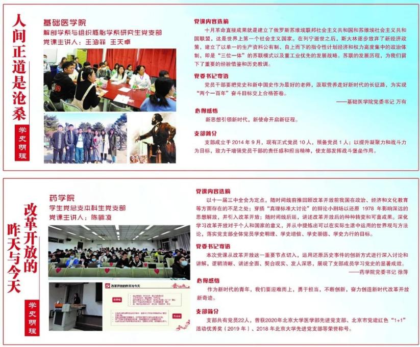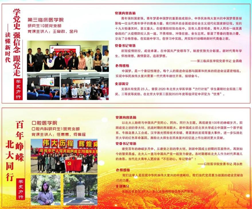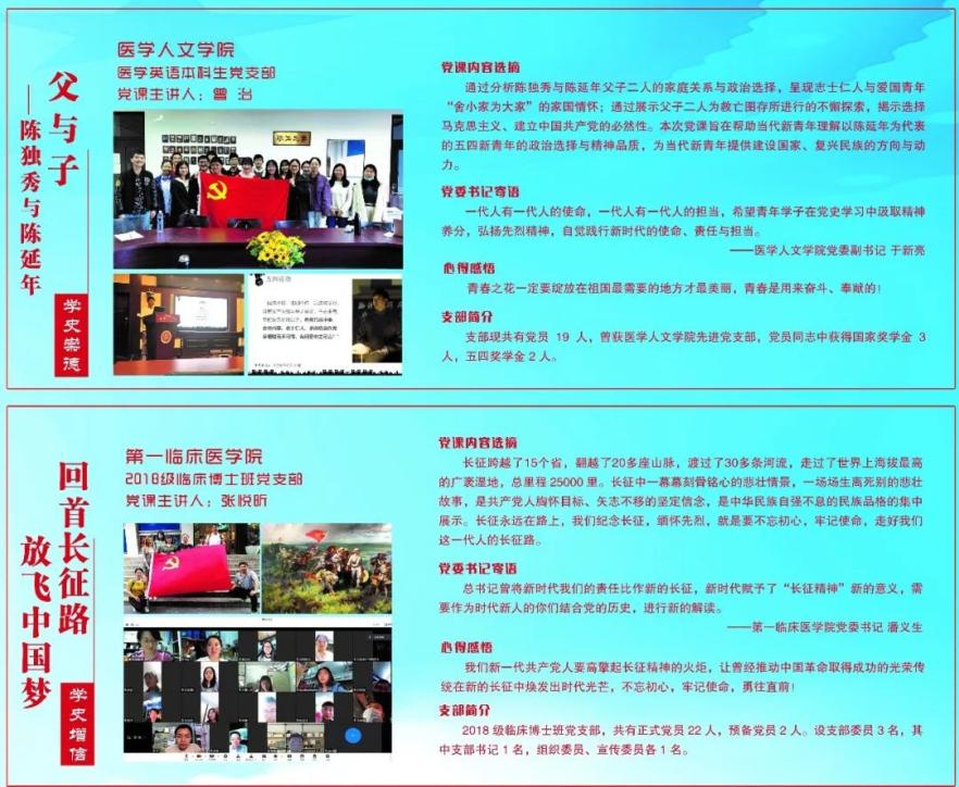 结合建党百年主题夯实青年学生党员理论根基,共8个学院、39个党支部、41堂党课参与,其中3堂党课获评beat365唯一官方网站“百堂精品党课”,分别为:基础医学院解剖学系与组织胚胎学系研究生党支部组织的“人间正道是沧桑”、公共卫生学院卫生政策与管理学系研究生党支部组织的“重温‘春天的故事’:探寻医药卫生事业发展足迹”、第三临床医学院研究生10班党支部组织的“学党史,强信念,跟党走:读懂新时代!”。