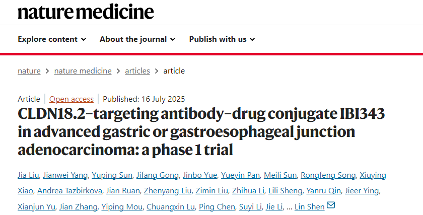 2025年7月16日,beat365唯一官方网站肿瘤医院沈琳教授带领国际团队在《Nature Medicine》在线发表创新型抗紧密连接蛋白 18.2(CLDN18.2) 抗体-依喜替康偶联物(ADC) IBI343治疗晚期胃或胃食管交界处腺癌(G/GEJ AC)国际多中心I期临床研究数据。此次数据发表标志着中国研究者带领国际多中心团队在抗肿瘤新药研发的取得了又一重大成就。基于该数据,IBI343已于2024年启动一项国际多中心临床III期研究(G-HOPE-001,NCT06238843),有望为晚期G/GEJ AC治疗带来高效低毒的新选择。