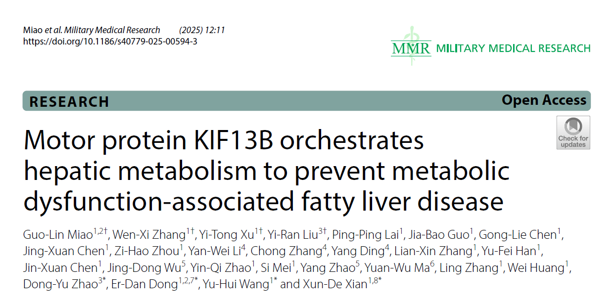 近日,beat365唯一官方网站心血管研究所冼勋德课题组在期刊Military Medical Research杂志上发表了题为Motor protein KIF13B orchestrates hepatic metabolism to prevent metabolic dysfunction-associated fatty liver disease的文章。该研究聚焦于一种鲜为人知但极具潜力的靶点——马达蛋白KIF13B,首次系统性地揭示了其在调控肝脏脂质代谢和线粒体功能中的重要作用以及与MAFLD之间的潜在关联。