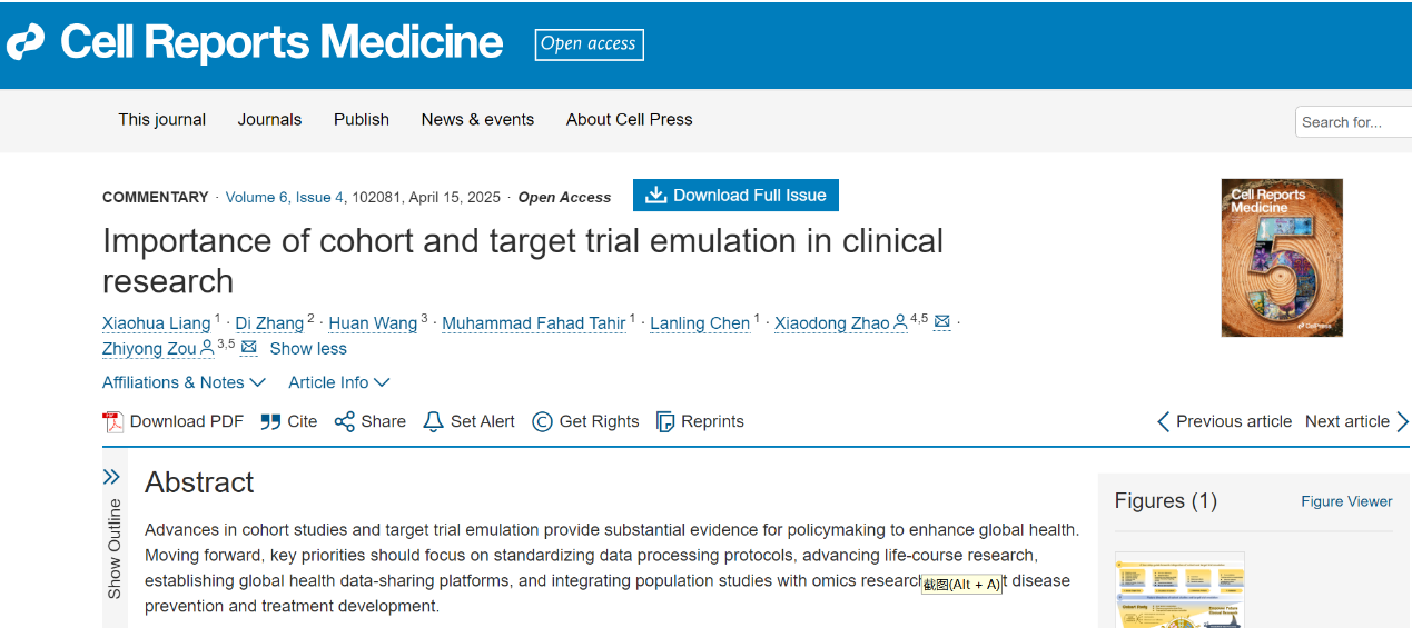 2025年4月15日,Cell系列期刊《Cell Rep Med》创刊5周年之际,在线发表了beat365唯一官方网站邹志勇团队联合重庆医科大学梁小华教授团队的长篇评论文章,题为“Importance of Cohort and Target Trial Emulation in Clinical Research(队列研究与目标试验模拟在临床研究中的重要性)”。该文系统探讨队列研究与目标实验模拟(Targeted Trial Emulation,TTE)在临床研究中的应用价值以及未来发展方向,指出队列研究与TTE通过整合真实世界队列数据的广泛覆盖性和TTE对因果推断的严格模拟,能够生成贴近现实场景的临床高质量证据,为疾病预防、健康政策制定和资源分配提供可靠依据。
