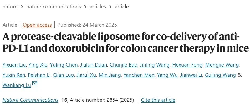 2025年3月24日,天然药物及仿生药物全国重点实验室吕万良教授团队在国际学术期刊《自然-通讯》(Nature Communications)上发表了题为A protease-cleavable liposome for co-delivery of anti-PD-L1 and doxorubicin for colon cancer therapy in mice(一种蛋白酶可裂解脂质体共递送PD-L1抗体和阿霉素治疗小鼠结肠癌)的最新研究成果。