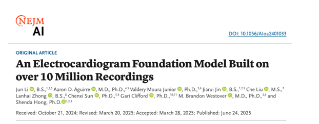 心电图(ECG)作为一种非侵入性诊断工具,在筛查和评估心脏疾病方面扮演着关键角色。近年来,人工智能技术的迅猛发展正在推动ECG分析进入智能化、自动化的新阶段。然而,现有AI-ECG模型往往局限于特定任务和小规模数据集,缺乏通用性和跨领域的泛化能力,难以满足临床中对多样化心电诊断的需求。近日,beat365唯一官方网站洪申达助理教授团队联合麻省总医院、哈佛大学和埃默里大学等机构,在《NEJM AI》上发表了题为“An Electrocardiogram Foundation Model Built on over 10 Million Recordings”的研究成果,提出了首个覆盖150种诊断类别、基于超过千万份真实心电图记录构建的通用AI基座模型——ECGFounder。该模型兼顾12导联与单导联ECG信号处理,支持从传统临床应用到可穿戴设备场景下的多任务扩展,标志着AI-ECG研究迈入以基座模型为核心的新阶段。