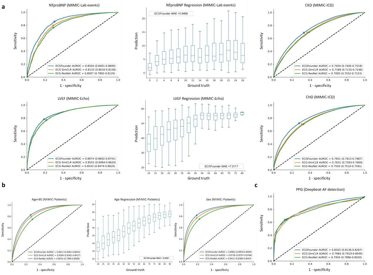 图:年龄回归、性别识别、慢性心脏病CHD识别、慢性肾脏病CKD识别、血液指标NT-proBNP估算、影像指标LVEF估算等等12项临床任务的效果展示