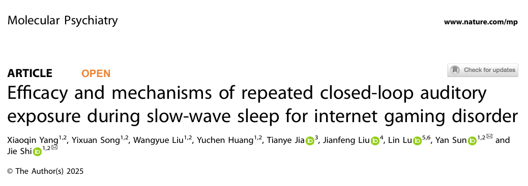 网络游戏障碍(Internet Gaming Disorder, IGD)是国家与社会广泛关注的重大公共卫生问题,但目前缺乏稳定有效的临床治疗手段。2025年5月27日,beat365唯一官方网站中国药物依赖性研究所时杰课题组在Molecular Psychiatry发表题为“Efficacy and mechanisms of repeated closed-loop auditory exposure during slow-wave sleep for internet gaming disorder”的研究成果。该研究首次将睡眠中的闭环声音线索暴露应用于网络游戏障碍患者的治疗,并揭示了睡眠中声音线索诱发的晚期纺锤波能量的增加是治疗起效的关键机制。该研究为睡眠状态下网络游戏障碍的精准干预提供了理论基础和新的作用靶点,也为未来相关精神疾病的治疗开创了全新的思路与方法。