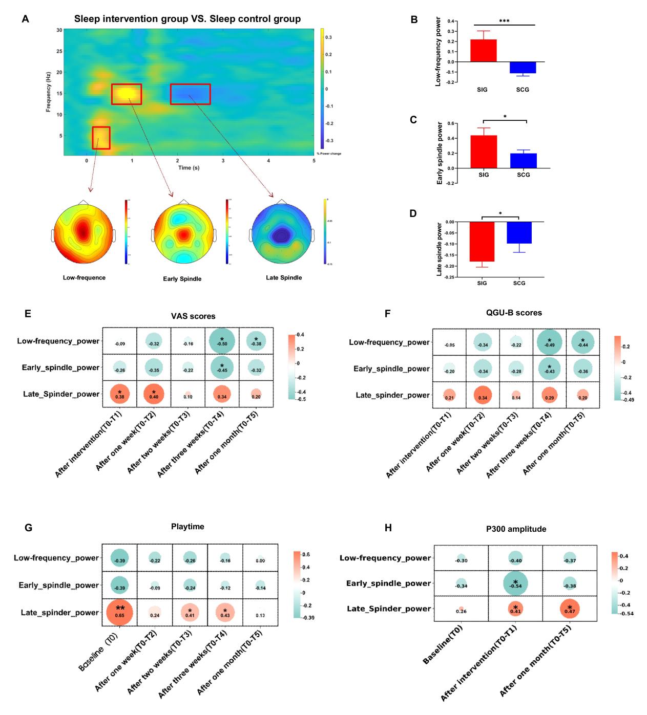 进一步的机制探索发现,在声音线索诱发的脑电时频成分中,睡眠干预组的低频能量和早期纺锤波能量显著高于睡眠对照组,并与渴求和游戏时间降低呈显著负相关;而其晚期纺锤波能量则显著低于睡眠对照组,与渴求和游戏时间降低呈显著正相关,并随着干预进程呈显著线性增加趋势。