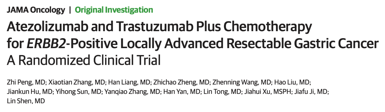 Peng Z, Zhang X, Liang H, Zheng Z, Wang Z, Liu H, Hu J, Sun Y, Zhang Y, Yan H, Tong L, Xu J, Ji J, Shen L. Atezolizumab and Trastuzumab Plus Chemotherapy for ERBB2-Positive Locally Advanced Resectable Gastric Cancer: A Randomized Clinical Trial. JAMA Oncol. 2025 Apr 17. doi: 10.1001/jamaoncol.2025.0522. Epub ahead of print. PMID: 40244574.